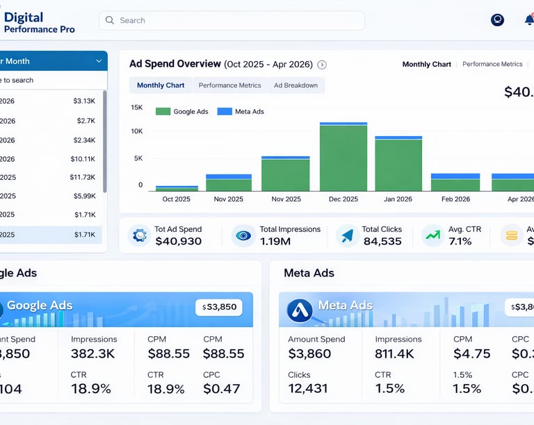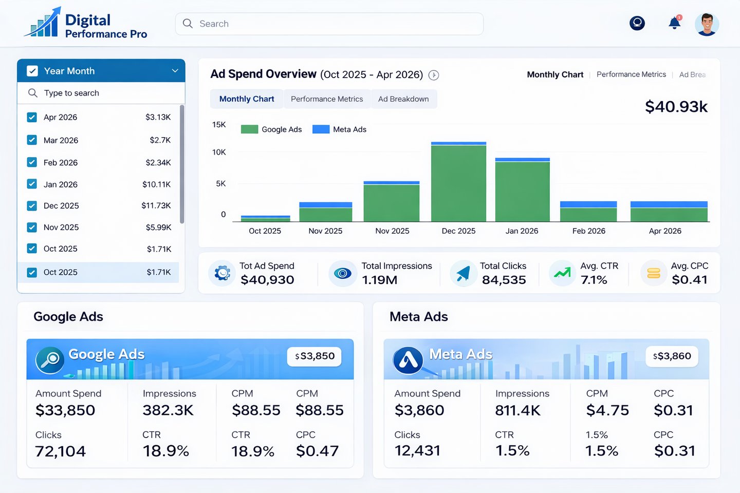 Digital Performance Pro is a performance marketing agency focused on scaling E-commerce sales and generating high-quality leads. We specialize in Google Ads and Meta Ads, using PPC strategies, advanced audience targeting, and continuous analysis to improve ROAS, ROI, CTR, and reduce CPL.